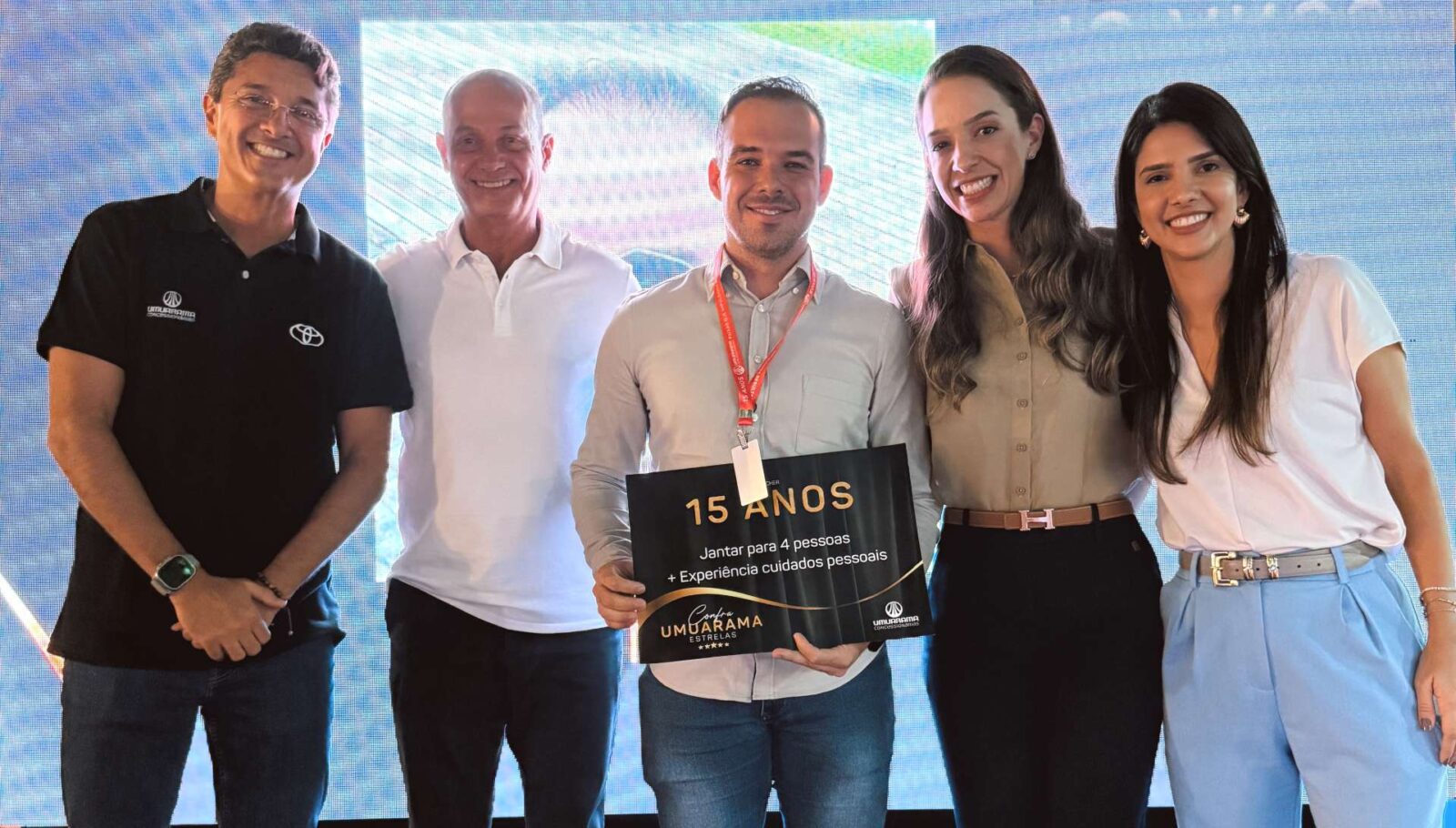 A sede da Umuarama Concessionárias, em Goiânia, foi palco da confraternização de fim de ano da empresa, reunindo colaboradores e lideranças em um clima de celebração, integração e reconhecimento. A noite foi marcada por coquetel especial e a entrega de prêmios aos destaques do ano. Em registro, o sócio-diretor Robério Pires, o CEO Ary Jorge, o gerente financeiro Régis Manoel e as sócias-diretoras Juliana e Luciana Pires, durante o momento de premiação da confraternização